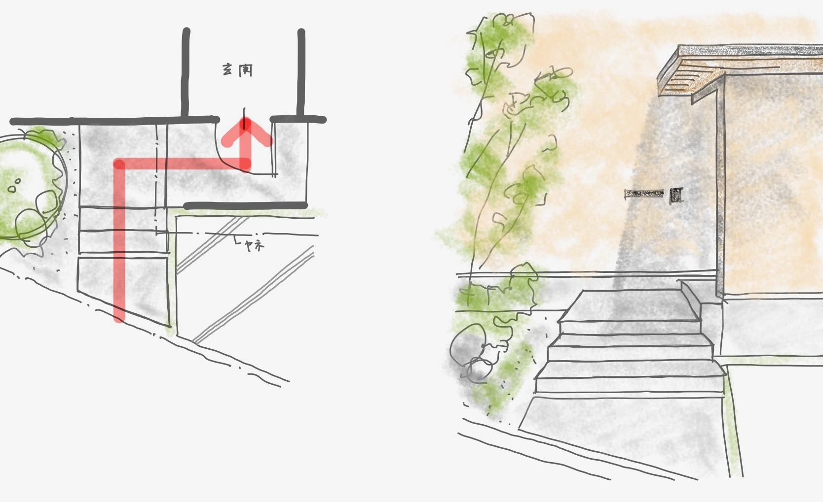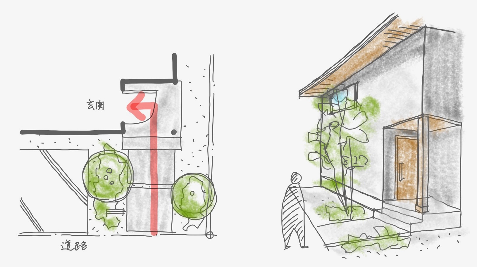 玄関ドアを隠す工夫をするだけで、外観がワンランクアップします。