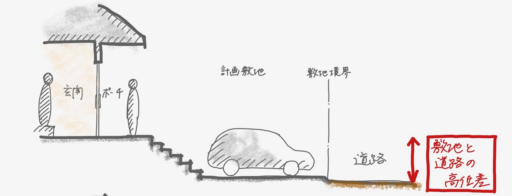 建物まわりの地面の高さと、全面道路の高さが大きく違う場合。